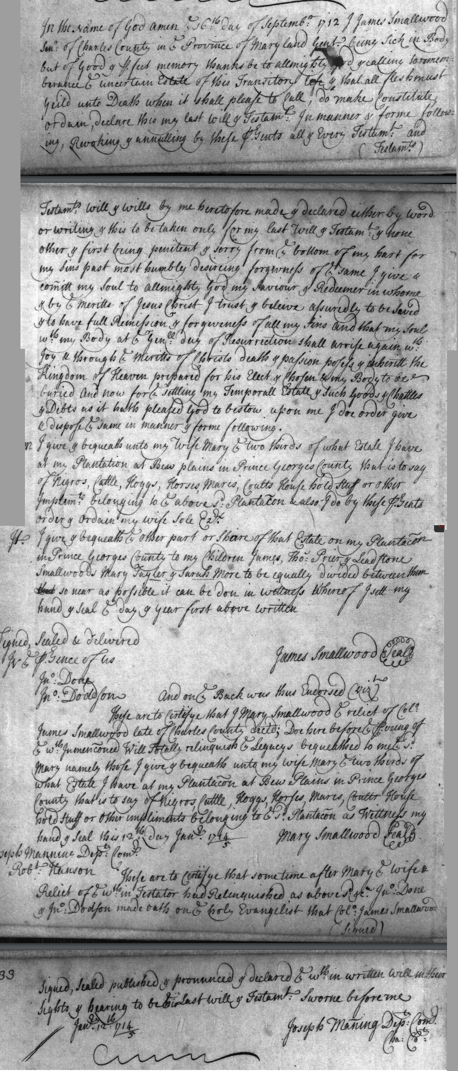Several descendant lines springing from the Charles Smallwood (c.1760-1823) who had settled in Beaufort County, North Carolina by 1790 were originally linked to this tree via Charles, son of James Smallwood and Catherine Clark, apparently in line with Marilu Burch Smallwood's book. However, the dates appear inconsistent (James and Catherine were having children in the 1790's), and it would appear that this Charles probably had his origins elsewhere.